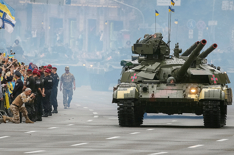 Выступление президента Порошенко.Фото: REUTERS Получил в ответ громогласное отрепетированное "Героям слава!». ‑ Нет, а ты что хотел? Собирался услышать про социальные стандатры, про экономику? - слышу разговор за моей спиной двух немолодых киевлян. - Про то, что у нас « труба» полная, он тебе будет рассказывать? Как бы не так! ‑ Да тише ты! - осекся его собеседник. – И вообще, сегодня праздник. "ЗА НАШИХ ХЛОПЦЕВ БЬЕТСЯ ОДНА САВЧЕНКО" По окончании парада отдельное шествие решили провести бойцы добровольческих батальонов. К ним присоединились матери и жены погибших бойцов. Националисты, начав свой митинг возле бывшего памятника Ленину, накануне пообещали свалить памятник Николаю Щорсу, но в последний момент передумали. Хотя декоммунизация все еще идет полным ходом: буквально накануне праздника с Украинского дома спилили болгаркой советские барельефы скульптора Валентина Борисенко. Ракетные комплексы "Точка-У" на параде в центре Киева.Фото: REUTERS –Мы, украинцы - свободная нация! Нас никогда не сделать рабами! - скандирует женщина, идущая в колонне. На чистом на русском языке, между прочим. Колонна идет на улицу Институтскую, где теперь хоронят бойцов добровольческих батальонов. ‑ Мой сын уже 745 дней плену,- рассказывает мать бойца из Кривого рога.– Последний раз видела сына по видео, которое мне прислали год назад. Наше правительство ничего не хочет делать по обмену пленными всех на всех. Вот уже год никаких обменов не проводится, а за наших хлопцев бьется одна только Надежда Савченко, но только ее никто не слушает. Украинские десантники проходят маршем по Киеву.Фото: REUTERS ЧАЙКОВСКИЙ, ПРОКОФЬЕВ - ГЕТЬ С МАЙДАНА! Скорби и военной риторики было так много, что разбавить ее захотели концертом симфонического оркестра на Майдане. Но дирижер-то что учудил! Взял да и составил программу их произведений Прокофьева, Мусоргского, Чайковского и других музыкальных врагов украинского народа. Но патриоты были начеку! Вовремя вмешались и вовремя остановили «пророссийскую» акцию. Великих композиторов немедленно отменили, заменили на патриотическую украинскую музыку. Лица бывших президентов на этом параде. (flackelf) ![]() |